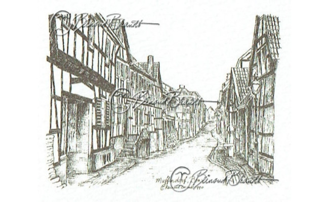 Deze tekening is ingelijst verkrijgbaar met glas en klemmen of in een bruine, zwarte of wortelnoot fineren lijst.
