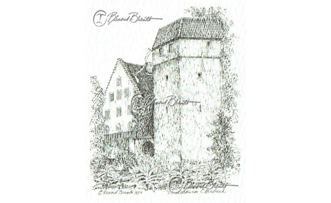 Deze miniatuur pentekening wordt gemonteerd in een uitgestanst passe-partout van 10x10 cm en wordt geleverd in een lijst naar keuze.