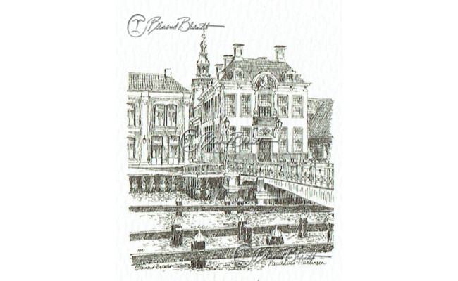 Deze miniatuur pentekening wordt gemonteerd in een uitgestanst passe-partout van 10x10 cm en wordt geleverd in een lijst naar keuze.