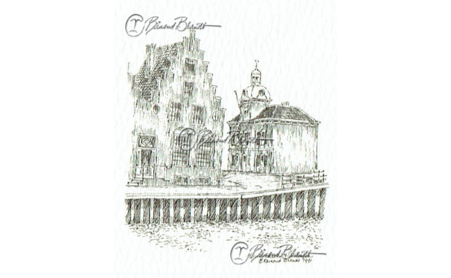 Deze miniatuur pentekening wordt gemonteerd in een uitgestanst passe-partout van 10x10 cm en wordt geleverd in een lijst naar keuze.
