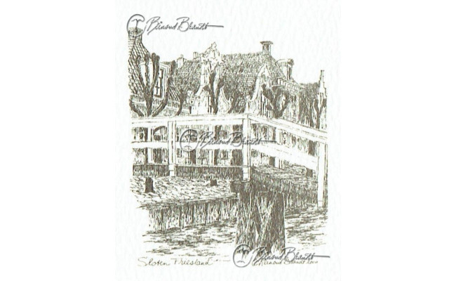 Deze miniatuur pentekening wordt gemonteerd in een uitgestanst passe-partout van 10x10 cm en wordt geleverd in een lijst naar keuze.