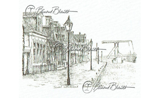 Deze tekening is ingelijst verkrijgbaar met glas en klemmen of in een bruine, zwarte of wortelnoot fineren lijst.