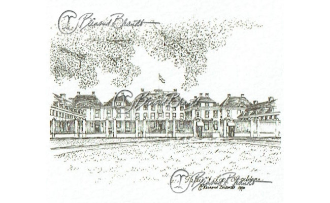 Deze miniatuur pentekening wordt gemonteerd in een uitgestanst passe-partout van 10x10 cm en wordt geleverd in een lijst naar keuze.