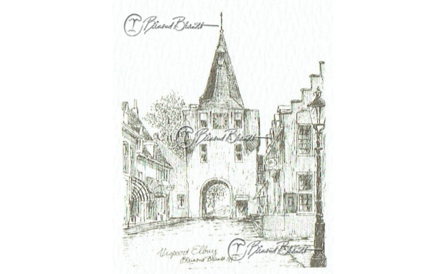 Deze tekening is ingelijst verkrijgbaar met glas en klemmen of in een bruine, zwarte of wortelnoot fineren lijst.