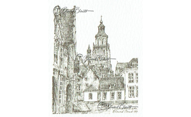 Deze tekening is ingelijst verkrijgbaar met glas en klemmen of in een bruine, zwarte of wortelnoot fineren lijst.