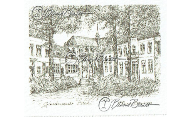 Deze miniatuur pentekening wordt gemonteerd in een uitgestanst passe-partout van 10x10 cm en wordt geleverd in een lijst naar keuze.