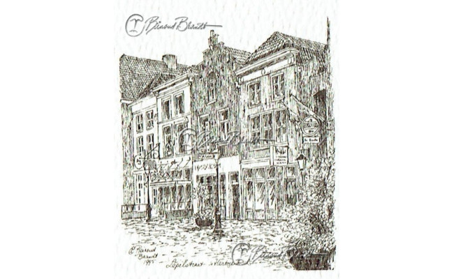 Deze miniatuur pentekening wordt gemonteerd in een uitgestanst passe-partout van 10x10 cm en wordt geleverd in een lijst naar keuze.