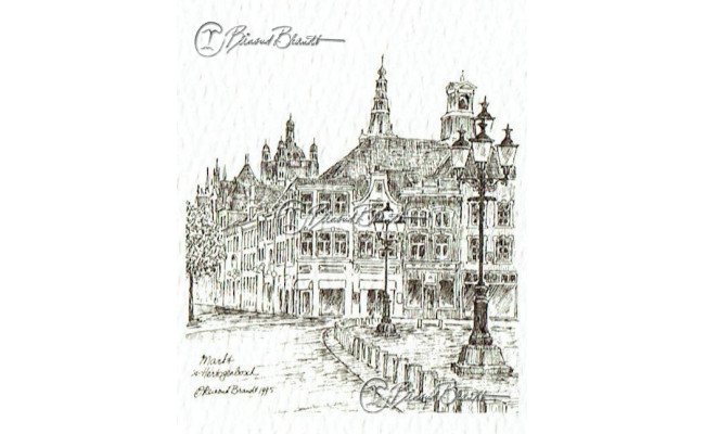 Deze tekening is ingelijst verkrijgbaar met glas en klemmen of in een bruine, zwarte of wortelnoot fineren lijst.