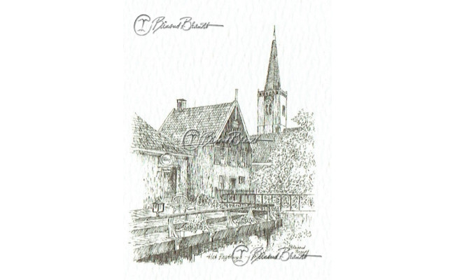 Deze miniatuur pentekening wordt gemonteerd in een uitgestanst passe-partout van 10x10 cm en wordt geleverd in een lijst naar keuze.