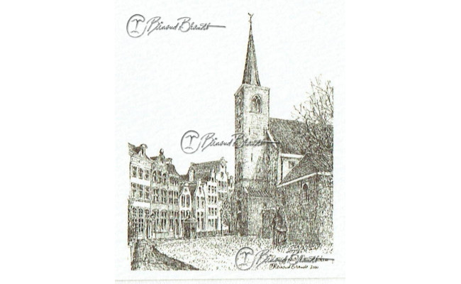 Deze miniatuur pentekening wordt gemonteerd in een uitgestanst passe-partout van 10x10 cm en wordt geleverd in een lijst naar keuze.