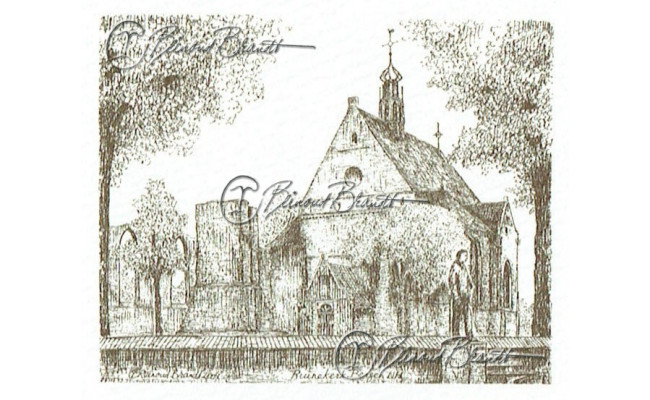 Deze miniatuur pentekening wordt gemonteerd in een uitgestanst passe-partout van 10x10 cm en wordt geleverd in een lijst naar keuze.