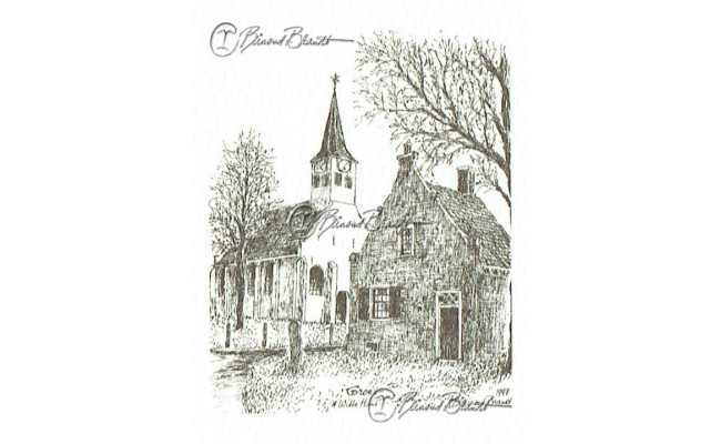 Deze miniatuur pentekening wordt gemonteerd in een uitgestanst passe-partout van 10x10 cm en wordt geleverd in een lijst naar keuze.