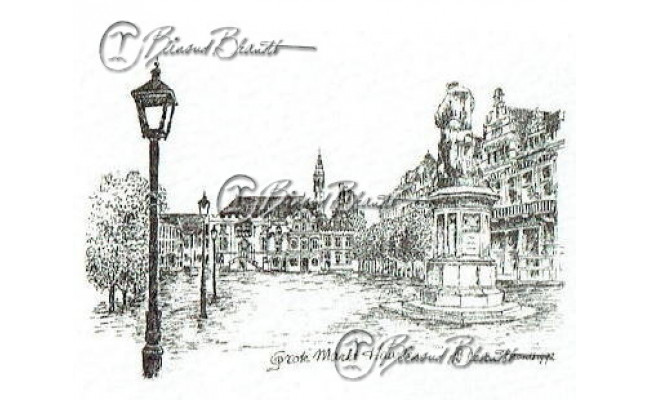 Deze tekening is ingelijst verkrijgbaar met glas en klemmen of in een bruine, zwarte of wortelnoot fineren lijst.