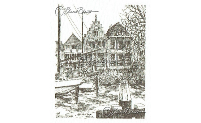 Deze miniatuur pentekening wordt gemonteerd in een uitgestanst passe-partout van 10x10 cm en wordt geleverd in een lijst naar keuze.