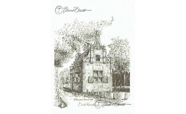 Deze miniatuur pentekening wordt gemonteerd in een uitgestanst passe-partout van 10x10 cm en wordt geleverd in een lijst naar keuze.
