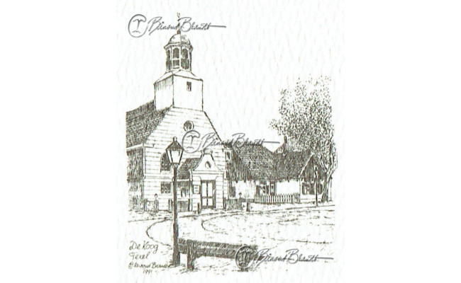 Deze tekening is ingelijst verkrijgbaar met glas en klemmen of in een bruine, zwarte of wortelnoot fineren lijst.