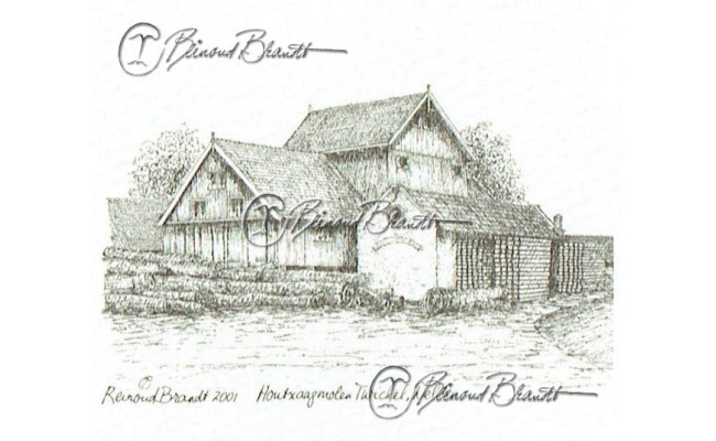 Deze tekening is ingelijst verkrijgbaar met glas en klemmen of in een bruine, zwarte of wortelnoot fineren lijst.