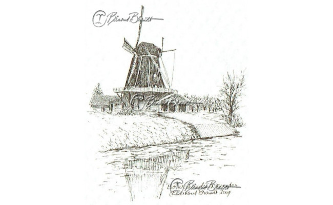Deze miniatuur pentekening wordt gemonteerd in een uitgestanst passe-partout van 10x10 cm en wordt geleverd in een lijst naar keuze.