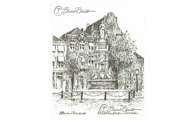 Deze miniatuur pentekening wordt gemonteerd in een uitgestanst passe-partout van 10x10 cm en wordt geleverd in een lijst naar keuze.