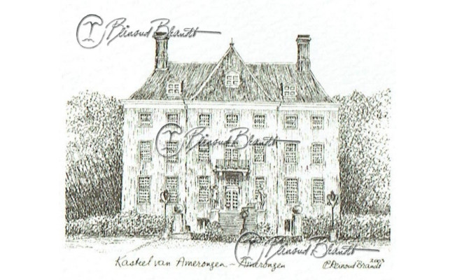 Deze tekening is ingelijst verkrijgbaar met glas en klemmen of in een bruine, zwarte of wortelnoot fineren lijst.