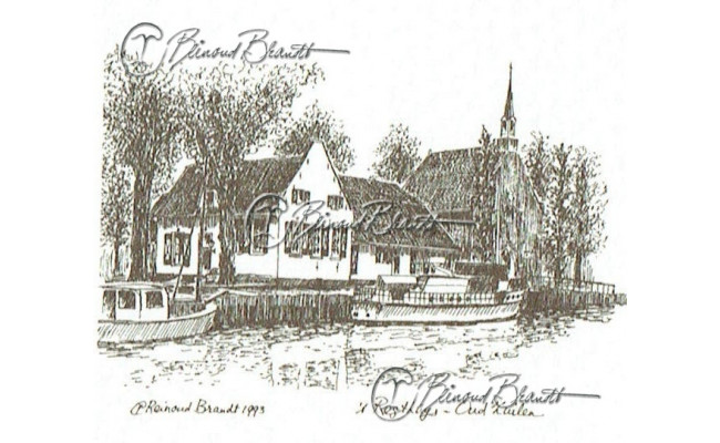 Deze tekening is ingelijst verkrijgbaar met glas en klemmen of in een bruine, zwarte of wortelnoot fineren lijst.