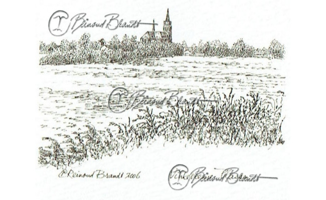 Deze tekening is ingelijst verkrijgbaar met glas en klemmen of in een bruine, zwarte of wortelnoot fineren lijst.