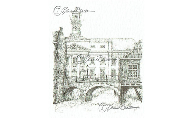 Deze miniatuur pentekening wordt gemonteerd in een uitgestanst passe-partout van 10x10 cm en wordt geleverd in een lijst naar keuze.