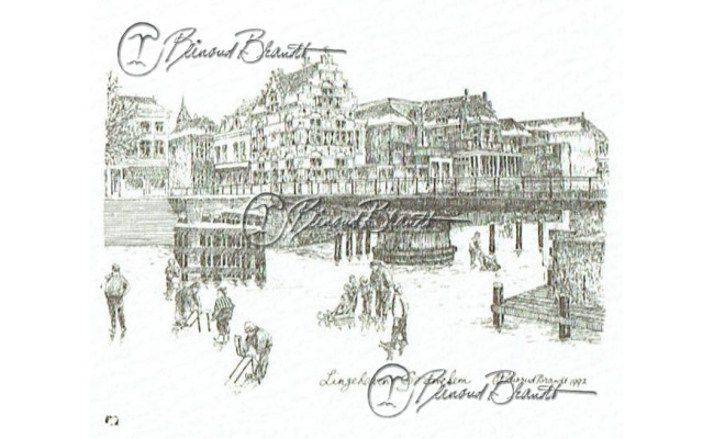 Deze tekening is ingelijst verkrijgbaar met glas en klemmen of in een bruine, zwarte of wortelnoot fineren lijst.