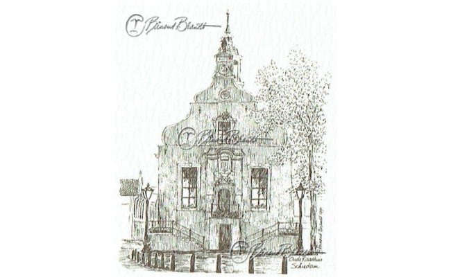 Deze miniatuur pentekening wordt gemonteerd in een uitgestanst passe-partout van 10x10 cm en wordt geleverd in een lijst naar keuze.