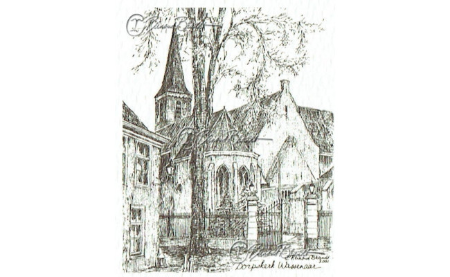 Deze miniatuur pentekening wordt gemonteerd in een uitgestanst passe-partout van 10x10 cm en wordt geleverd in een lijst naar keuze.
